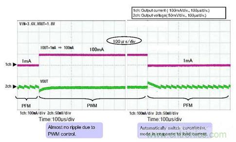 圖3 PFM控制和PWM控制自動(dòng)轉(zhuǎn)換波形(負(fù)載電流:1mA⇔100mA)