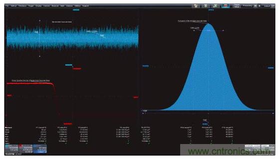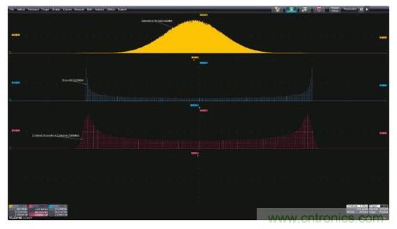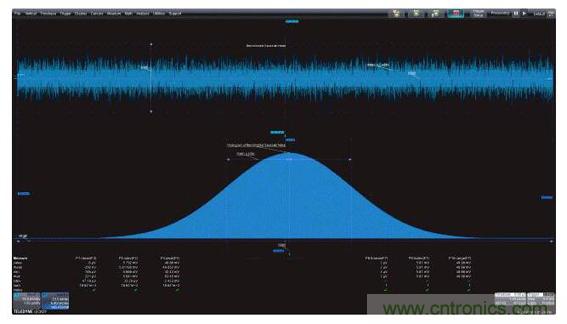 圖1:左上圖是帶寬受限的高斯噪聲的時(shí)域圖,左下圖是功率譜密度,是帶寬受限噪聲的頻域圖;右面的柱狀圖是帶寬受限噪聲的統(tǒng)計(jì)圖。這三個(gè)視圖都因采用了有助于對(duì)測(cè)量進(jìn)行量化的測(cè)量參數(shù)而得到增強(qiáng)。