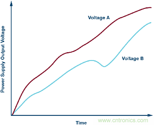 除了電壓時序之外,啟動過程中還可能要求電壓單調(diào)上升。這意味著電壓僅線性上升,如圖4中的電壓A所示。此圖中的電壓B是電壓非單調(diào)上升的例子。在啟動過程中,當電壓上升到一定電平時負載開始拉大電流,就會發(fā)生這種情況。防止這種情況的一種辦法是延長電源的軟啟動時間,并選擇能夠快速提供大量電流的電源轉換器。