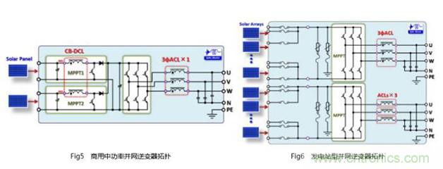目前廣泛采用的非隔離并網(wǎng)住宅型光伏逆變器,其功率基本上為1.5 KW ~ 6 KW左右。為了實現(xiàn)高的性價比,并最大限度地提高轉(zhuǎn)換效率,業(yè)界甚至采用了SiC半導(dǎo)體、H5拓?fù)洹?電平拓?fù)涞雀鞣N新式技術(shù),但其最基本的拓?fù)洳煌夂鯃D3、4兩種: