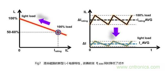從中可知,要顯著提高其綜合效率,就必須最大限度地控制好較輕負(fù)荷時的功率損耗。利用混合磁路中不同磁材的特性,通過對其磁路長度、磁阻及繞線匝數(shù)等影響電感特性的諸要素進(jìn)行優(yōu)化調(diào)節(jié),使之符合圖7所示的L-I直流電感偏置特性,從而可實現(xiàn)歐效改善與低成本設(shè)計的兼顧。