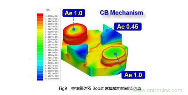對于這種新型高效電感的設(shè)計,和Boost電感設(shè)計要求一樣,要求該電感在大紋波電流工作時,保持極佳的效率。由于其電感量可以設(shè)計成比較小的感值,即使要求直流內(nèi)阻較低,用銅量也能得到大幅的控制。對于磁性材料中的ΔB磁場變化率大的問題,同樣地采用Hybrid Magnetics技術(shù),可以控制磁性的損耗、減少漏磁的存在,達(dá)到很少的用銅量也能保持很低的內(nèi)阻的目的。