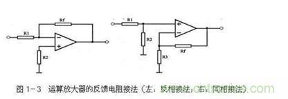 其次,由于放大倍數(shù)為無(wú)窮大,所以不能將運(yùn)算放大器直接用來(lái)做放大器用,必須要將輸出的信號(hào)反饋到反相輸入端(稱為負(fù)反饋)來(lái)降低它的放大倍數(shù)。如圖1-3中左圖所示,R1的作用就是將輸出的信號(hào)返回到運(yùn)算放大器的反相輸入端,由于反相輸入端與輸出的電壓是相反的,所以會(huì)減小電路的放大倍數(shù),是一個(gè)負(fù)反饋電路,電阻Rf也叫做負(fù)反饋電阻。