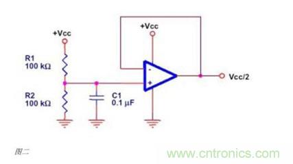 單電源工作的運(yùn)放需要外部提供一個(gè)虛地,通常情況下,這個(gè)電壓是VCC/2,圖二的電路可以用來(lái)產(chǎn)生VCC/2的電壓,但是他會(huì)降低系統(tǒng)的低頻特性。