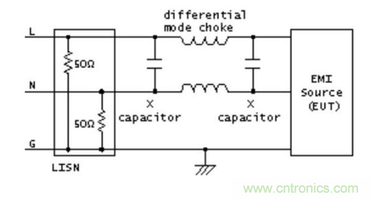 電容的作用是將高頻干擾電壓“短路”,另外,當干擾信號頻率很高時,抑制線圈將產(chǎn)生很大的交流阻抗。圖2顯示了兩種濾波類型的結(jié)構(gòu),其中,LISN是用于測量目的的線性阻抗穩(wěn)定網(wǎng)絡。如果是共模問題引起的干擾,X類型電容基本上沒有作用,因為兩線上的干擾電壓是一樣的。因此,了解干擾類型對于選擇合理的電路結(jié)構(gòu)將起重要作用,并為解決問題提供技術(shù)依據(jù)。