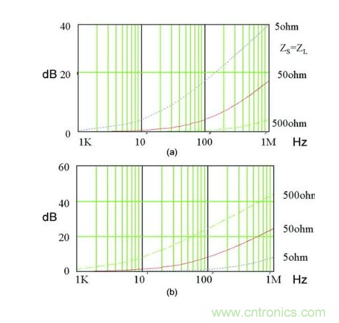 上面的例子說明,選擇一個具有很高插損的濾波器也不能很好抑制傳導噪聲的原因是,電源輸入端阻抗的影響。因此,設計者除了選擇一個合適的濾波器之外,還需要了解電源的阻抗特性、共模阻抗和差模阻抗。阻抗測試可以借助專用的阻抗測試儀或者傳導分析儀。一種濾波器的共模阻抗(a)和差模阻抗(b)的變化如圖5所示。