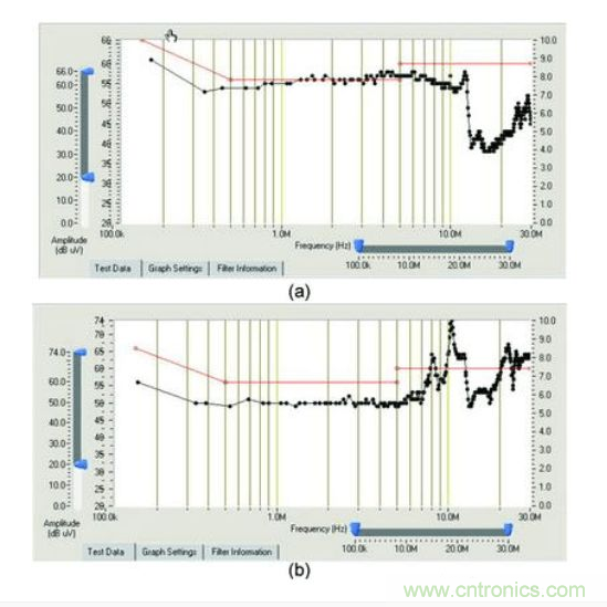 在標準電磁兼容性測試實驗室可得到設備的總干擾情況,但無法了解設備的共模干擾和差模干擾特性。為了在測量中分辨共?;蛘卟钅8蓴_信號,通用的儀器是很難實現(xiàn)的。使用專用的傳導測試儀,可獲得設備的總干擾、共模干擾和差模干擾。測試結(jié)果如圖3所示。