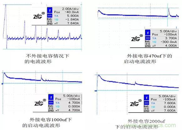 上圖為外接電容大小不同的啟動電流波形。外接電容在一定情況下,啟動電流達到最低值,對整個電路的輸入,輸出環(huán)境有很大的改善。當外接電容超過這個范圍就會導致啟動電流增大,對其他器件的威脅也就隨之增大,導致出現(xiàn)不同程度的器件損壞。