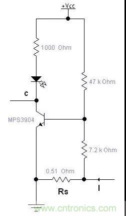 如果簡單的用三極管導(dǎo)通與截止來檢測電流的話,三極管開啟要0.7V左右,電流比較小的時候需要串比較大的采用電阻,同時浪費(fèi)較大的反饋電壓,如上圖方法,可以用比較小的電阻,消耗很小的電壓就能檢測到電流I,通過調(diào)整三極管基機(jī)電阻可以調(diào)整檢測的靈敏度。這個電路可以用在充電器等需要顯示有沒有充電電流的地方。