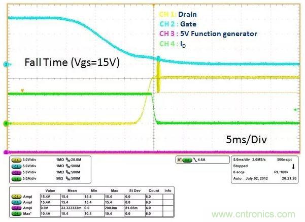 在電池保持板PCM過(guò)流關(guān)斷的過(guò)程中,從波形可以看到:功率MOSFET同樣也有較長(zhǎng)的一段時(shí)間工作于線性區(qū)。