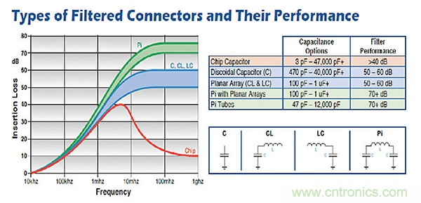 圖2還顯示了各種濾波器類型以及簡單芯片電容濾波器的相對濾波器性能。從這些數(shù)據可以看出,芯片電容的作用與前面提到的陷波濾波器相似,而C、CL、LC和Pi濾波器由平面陣列、盤狀電容器或陶瓷管構成,可提供更好的寬頻率和更高的濾波器性能總體水平。