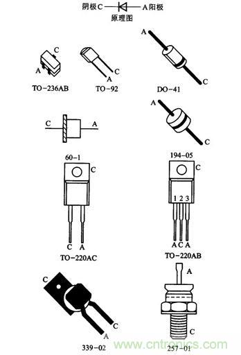 標(biāo)記,但是圖8-24的194-05封裝用了這種方法。TO-220AC封裝有兩個(gè)陰極引腳,其中金屬片使兩個(gè)陽(yáng)極連通。引腳和金屬片都可以用作肖特基二極管和電路連接端。而TO-220AB有兩個(gè)陽(yáng)極引腳。由于它內(nèi)部有二個(gè)肖特基二極管,陽(yáng)極有不同的端,但是內(nèi)部?jī)蓚€(gè)陰極是連接在一起的。