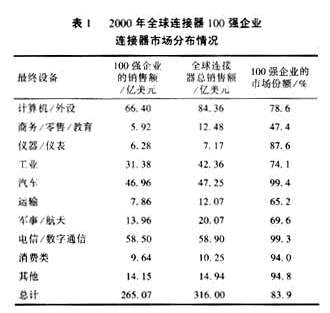 自2001年以來,受“9.11”恐怖事件、網(wǎng)絡通訊業(yè)泡沫破滅及美國經濟低迷的影響,世界連接器市場一度遭受重創(chuàng),2001年的銷售額下降19.1%,但是,軍用連接器市場卻在平穩(wěn)中微增。據(jù)Fleck的研究報告,軍事/航天用連接器2000年的銷售額為20.072億美元,2001年達到20.118億美元,增長0.2%。全球連接器100強企業(yè)占據(jù)了69.1%軍用連接器市場份額,如表1所示。各類軍用連接器也基本上由全球100強企業(yè)所壟斷,如表2所示。