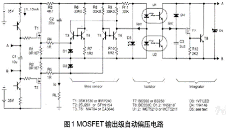 MOSFET的偏壓視實(shí)際使用的管子而定,通常在2V至10V間變化。為了應(yīng)對(duì)這一范圍,最終確定圖1 所示的自動(dòng)拓?fù)浣Y(jié)構(gòu)。積分器采用積分并聯(lián)穩(wěn)壓器,不僅結(jié)構(gòu)簡單,而且有較高的精度,還顯示出足夠低(<2Ω)的動(dòng)態(tài)輸出阻抗,能滿足來自驅(qū)動(dòng)級(jí)AC電流的要求。為了排除高頻處的交互作用,積分電容C3的取值應(yīng)使伺服環(huán)的單位增益頻率低于音頻譜。通常在1Hz與10Hz之間,具體數(shù)值取決于光耦合器的傳輸比,D4的作用是在管子截止期間讓C3放電,從而保護(hù)T7的柵極,想要可靠地工作;積分器輸入端低漏電是至關(guān)重要的,因此D4應(yīng)避免光照。穩(wěn)壓二級(jí)管D5額定值為最大可能偏壓加上少量的余量,以適應(yīng)特定設(shè)計(jì)的要求。倘若某個(gè)元件發(fā)生故障,或加以極端的測試信號(hào),該二級(jí)管能保護(hù)輸出級(jí)免受過大共模電流的損害。
