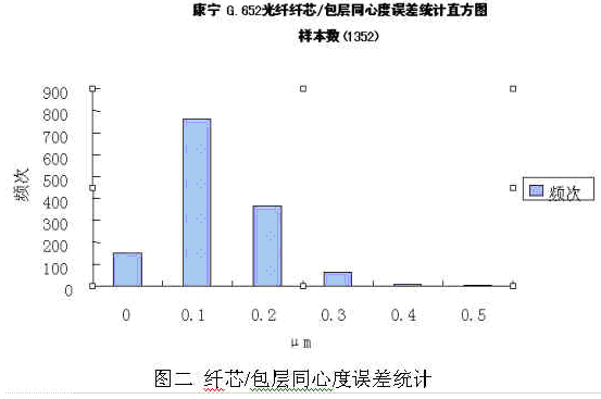 對(duì)于原材料之一的緊套光纜及光纖,成都康寧光纜全部采用美國(guó)康寧產(chǎn)光纖,依托康寧公司全球領(lǐng)先的光纜制造技術(shù),制造出國(guó)內(nèi)領(lǐng)先水平的緊套光纜,并用之于本公司的連接器跳線的生產(chǎn),確保光纖光纜原材料的品質(zhì)。圖二和圖三即是本公司采用的康寧公司G652光纖的主要特性參數(shù),其纖芯/包層同心度誤差和衰減系數(shù)統(tǒng)計(jì)值均遠(yuǎn)好于國(guó)內(nèi)相關(guān)行業(yè)標(biāo)準(zhǔn)的要求(行業(yè)標(biāo)準(zhǔn)的要求分別為≤0.5μm和≤0.5dB/km):