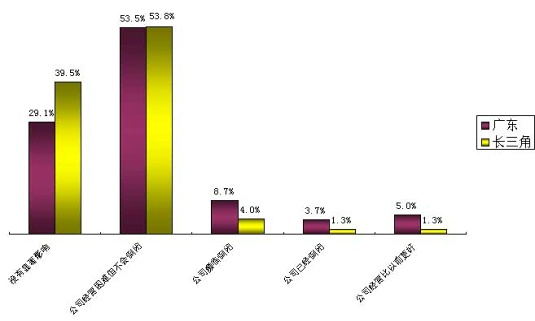 此項(xiàng)調(diào)查結(jié)果出乎我們的意料,選擇裁員的企業(yè)已經(jīng)占到了20.8%,但是多數(shù)企業(yè)還是選擇了調(diào)整經(jīng)營策略。我們特別希望有遠(yuǎn)見的企業(yè)不要把裁員作為應(yīng)對(duì)危機(jī)的主要措施,這也不符合我們“和諧社會(huì)”的主旋律。只要能正確的面對(duì),認(rèn)真分析企業(yè)的優(yōu)勢,研究市場的動(dòng)向,合理配置企業(yè)資源,充分發(fā)揮員工的潛力,調(diào)動(dòng)員工的積極性,企業(yè)一定會(huì)有新的轉(zhuǎn)機(jī)。企業(yè)如能和員工共克時(shí)艱,就會(huì)加深員工對(duì)企業(yè)的感情,這種情感會(huì)轉(zhuǎn)化為企業(yè)的一種優(yōu)勢資源。(見圖表四)