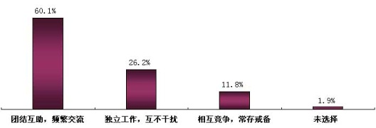 為了更深入了解電子工程師的生存環(huán)境,我們特意設(shè)置了這個(gè)問題。對(duì)每一位工程師來說,同事關(guān)系處理的如何,直接影響著他們的工作質(zhì)量和生活質(zhì)量,良好的同事關(guān)系,利人利己,利公利私。特別讓我們欣慰的是,60.1%的電子工程師和同事處于團(tuán)結(jié)互助,頻繁交流的工作狀態(tài),在目前經(jīng)濟(jì)危機(jī)的陰霾籠罩下,這樣同事關(guān)系顯的尤為重要。(見圖表七)