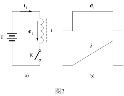 在圖1中,當(dāng)輸入電壓E加于開關(guān)電源變壓器初級線圈N1的兩端時,由于變壓器次級線圈產(chǎn)生的電動勢與流過二極管的電流方向正好相反,相當(dāng)于所有次級線圈均開路,此時開關(guān)變壓器相當(dāng)于一個電感L1。其等效電路如圖2-a) 所示,圖2-b) 是開關(guān)接通時,電感兩端的電壓和流過電感L1的電流。