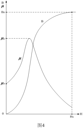 由圖4中可以看出,導(dǎo)磁率最大的地方并不是磁感應(yīng)強(qiáng)度或磁場強(qiáng)度最小或最大的地方,而是位于磁感應(yīng)強(qiáng)度或磁場強(qiáng)度的某個中間值的地方。當(dāng)導(dǎo)磁率達(dá)到最大值之后,導(dǎo)磁率將隨著磁感應(yīng)強(qiáng)度或磁場強(qiáng)度增大,而迅速下降;當(dāng)導(dǎo)磁率下降到將要接近0的時候,我們就認(rèn)為變壓器鐵芯已經(jīng)開始飽和。如圖中Bs和Hs。