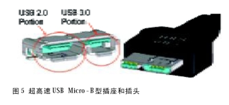 解決方案:在現(xiàn)有插頭和插座的插入面新增5 條導(dǎo)線。這樣就提供了與USB 2.0相同的機械接口,提供了完整的后向兼容性(見圖3~圖5)。現(xiàn)有的Micro-B 型插座(見圖5)無法提供空間用于新增5條導(dǎo)線,因此需要進(jìn)行較大的更改,用同時提供2.0和3.0接口的方案。這種連接器應(yīng)該只用于小型的便攜式設(shè)備。為了避免不正確的插入,超高速USB Micro-A和AB型連接器與Micro-B 型連接器在咬合栓和輪廓方面是不同的,但在其他方面則完全相同。與機械后向兼容性一樣,這樣做的目的是保留大量的設(shè)備驅(qū)動基礎(chǔ)設(shè)施。相同的數(shù)據(jù)傳輸類型、中斷、塊狀和等時存儲設(shè)備都保留了下來。最后,這個標(biāo)準(zhǔn)保留了現(xiàn)有USB的易用性。