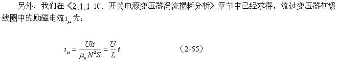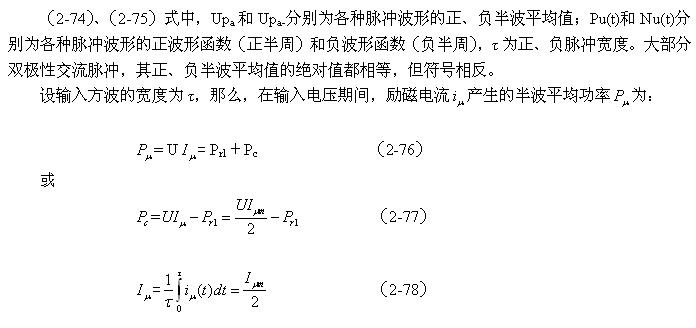 順便指出:(2-84)式的結(jié)果,是認(rèn)為渦流損耗在t1-t2期間(圖2-26-b)完全等于0而求得的,但實(shí)際上,在t1-t2期間變壓器初級線圈產(chǎn)生的反電動(dòng)勢同樣也會(huì)在變壓器鐵芯中感應(yīng)產(chǎn)生渦流損耗電流,即當(dāng)輸入電壓為0時(shí)刻,在變壓器鐵芯中還存在很短暫時(shí)間的渦流損耗;由于這種渦流損耗是由反電動(dòng)勢提供能量來維持的,它將隨著反電動(dòng)勢能量的衰減很快就衰減到0。