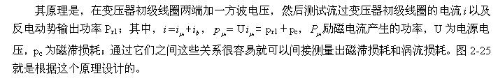 因此,(2-81)、(2-82)、(2-83)、(2-84)式最好只用于對正激式輸出的單激式開關(guān)電源變壓器進(jìn)行磁滯損耗和渦流損耗功率測試,因?yàn)槠涑跫壘€圈的電感相對比較大,勵(lì)磁電流比較??;如果需要對反激式輸出的單激式開關(guān)電源變壓器進(jìn)行測試,最好只用于對小功率開關(guān)電源進(jìn)行對比測試。