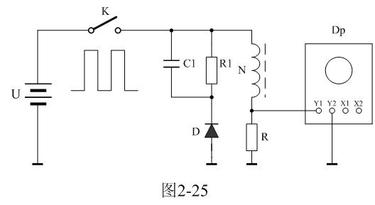 圖2-25中,U是電源電壓,通過控制開關(guān)K不斷地接通和關(guān)斷,就可以把電源電壓調(diào)制成單極性電壓脈沖;N為變壓器初級線圈,D為反激輸出整流二極管;R1為反激輸出負(fù)載電阻;C1為濾波電容;R為取樣電阻,通過測量R兩端的電壓,就可以知道流過變壓器初級線圈的電流;取樣電壓被送到示波器Dp進(jìn)行顯示。