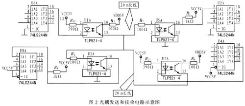 采用光電隔離器TLP521-4對(duì)發(fā)送和接收設(shè)備進(jìn)行電氣隔離,對(duì)于減小交流阻抗的作用十分明顯,進(jìn)而增大傳輸電流,有效地抑制地線噪聲;同時(shí)由于74LS244N的應(yīng)用??偩€驅(qū)動(dòng)能力得到保障。圖2為光耦發(fā)送和接收電路示意圖。圖2中,上半部?jī)晒怦钭宰笙蛴覀鬏斝盘?hào),下半部?jī)晒怦钭杂蚁蜃髠鬏斝盘?hào),左端74LS244N通過(guò)靜態(tài)存儲(chǔ)器IDT7132與處理器進(jìn)行數(shù)據(jù)交換,右端通過(guò)8255與處理器進(jìn)行數(shù)據(jù)交換。