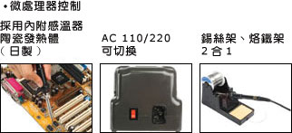采用精密CPU數(shù)位控溫電路, 和日本進口陶瓷發(fā)熱體, 精準(zhǔn)控制溫度200~480ºC, 整體防靜電結(jié)構(gòu), 輸入電壓AC 110V/220V可切換, 配合安全回路保護, 流線可堆疊外型, 開關(guān)前置、斜面無視角差, 適合各種環(huán)境使用焊臺、烙鐵架分離設(shè)計, 并具有錫絲架功能、使用便利.