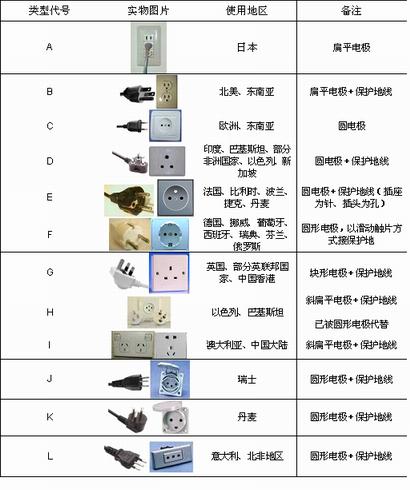 交流電墻壁插座的歷史不過80年,此間隨著用電量、用電經(jīng)驗(yàn)與事故教訓(xùn)的增加,由于技術(shù)、安全性、經(jīng)濟(jì)性等因素,加之地理、歷史、政治等原因,世界各地在發(fā)展民用電器供電裝置時(shí),并沒有采用美國(guó)最初的插座設(shè)計(jì)而形成了不同標(biāo)準(zhǔn),使得墻壁插座形式多種多樣。美國(guó)商務(wù)部統(tǒng)計(jì)了全球常見電源插頭/座(表2.1)樣式,并以字母進(jìn)行了分類。