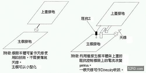 一般數(shù)位地表波播送使用波長為400~600nmUHF(UltraHighFrequency)的頻寬,然而實(shí)際上物理特性上限制,使得一般傳統(tǒng)移動終端得天線不容易小型化,因此將移動終端機(jī)殼的改成抽取或是折疊設(shè)計,形成如圖4右側(cè)直接激振天線。