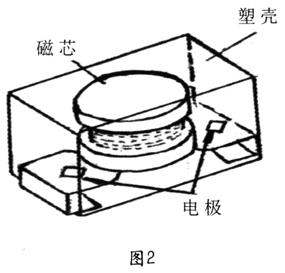 另一種形式的片式電感器是片式繞線電感器,這是對傳統(tǒng)繞線型電感器的一種改進,采用微小型工字型磁芯,經(jīng)繞線、焊接、電極成型、塑封等工序制成,見圖2。這種類型的片式電感生產工藝簡單,電性能優(yōu)良(電感量大,品質因素高),適合于大電流通過,可靠性好。但受磁芯尺寸和制造工藝限制,進一步微小型有困難。