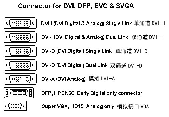 DVI-A是一種模擬傳輸標(biāo)準(zhǔn),晚期的大屏幕專業(yè)CRT中能看見(jiàn)。不過(guò)由于和VGA沒(méi)有本質(zhì)區(qū)別,性能也不高,因此DVI-A事實(shí)上已經(jīng)被廢棄了。至于DFP接口,這是一種已經(jīng)被廢棄的早期的數(shù)字規(guī)范。
