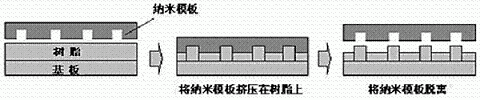 納米印刷技術(shù)的基本原理如圖1所示,就是把有納米級(jí)凹凸圖形的模板擠壓在涂覆了樹脂薄膜的基板上,再在樹脂薄膜的表面復(fù)制凹凸圖形。在普通的納米印刷技術(shù)中,能等倍復(fù)制模板,而在高寬比納米印刷技術(shù)中,則能形成高出納米模板凹部的結(jié)構(gòu)體。