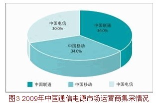 2009年中國移動、中國聯(lián)通及中國電信三大運營商都對通信電源產(chǎn)品進行了批量采購,三家運營商采購規(guī)模相差不大,其中中國聯(lián)通的集采量略高于其他兩家運營商,占36.0%的份額。圖3是2009年中國通信電源市場運營商集采情況。