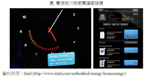 如同前述的家庭能源管理項(xiàng)目,Intel儀表板透過ZigBee無線技術(shù)連結(jié)家中的各項(xiàng)家電,監(jiān)控用電狀況。此外,透過WiFi連結(jié)家中寬頻網(wǎng)路,可與當(dāng)?shù)氐碾娏具M(jìn)行資訊傳遞或更新(或透過Zigbee技術(shù)與智慧電表連結(jié),進(jìn)一步與電力公司連線)。而透過儀表板上顯示的差異電價(jià)時(shí)段或市面上各項(xiàng)家電的耗能(節(jié)費(fèi))資訊,儀表板可以提供使用者用電與家電購置的建議,甚至可協(xié)助計(jì)算需使用多久的時(shí)間才能回本。