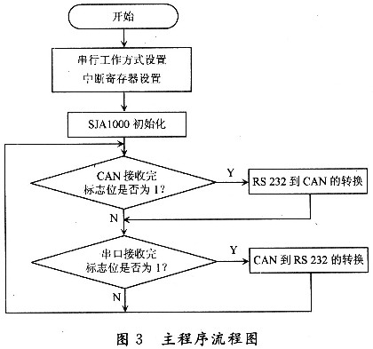 在微處理控制下,RS232和CAN進(jìn)行數(shù)據(jù)交換時,采用串口接收和CAN中斷方式可提高工作效率。SJAl000的初始化在復(fù)位模式下才可以進(jìn)行,主要包括工作方式的設(shè)置、時鐘分頻和驗收濾波寄存器的設(shè)置、波特率參數(shù)的設(shè)置以及中斷允許寄存器的設(shè)置等。其主程序流程圖如圖3所示。