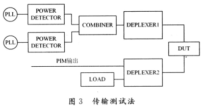 該系統(tǒng)中兩個大功率載頻f1和f2通過雙工濾波器發(fā)射到DUT,終端接50 Ω負(fù)載。PIM產(chǎn)生的雜散信號在DUT中產(chǎn)生,并在兩個方向傳播——“前向”到匹配負(fù)載,“反向”到雙工濾波器。發(fā)射激勵信號的頻率和被測的IM產(chǎn)物的頻率由雙工濾波器的TX和RX通道決定。接收機測量反向傳播的IM波功率。