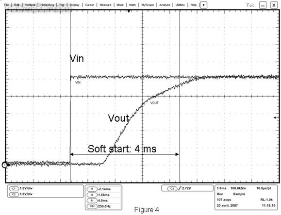 正如“電氣特性和防護(hù)措施”小節(jié)所述那樣,浪涌電流是造成器件電氣損壞的根源之一,需要采用OVP器件來(lái)克服這一問(wèn)題。為了避免任何類型的浪涌行為,OVP器件中通常都包含了軟啟動(dòng)順序。這個(gè)特殊順序貫穿于PFet門的逐漸上升過(guò)程中,見(jiàn)圖4。