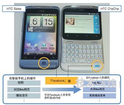 HTC發(fā)布了兩款適合使用SNS“Facebook”的智能手機。當(dāng)利用攝像頭拍照等預(yù)測用戶想在Facebook上共享信息時,F(xiàn)acebook鍵會自動閃光。摁下該鍵就會進入上傳信息的畫面。