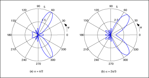 除了改變波瓣的寬度,通過對連續(xù)單個(gè)天線的信號(hào)設(shè)定固定的相位延遲α(圖3),還可以實(shí)現(xiàn)主波瓣在x–y平面內(nèi)的旋轉(zhuǎn)。天線陣列的輻射圖正比于天線陣列系數(shù)F(u):