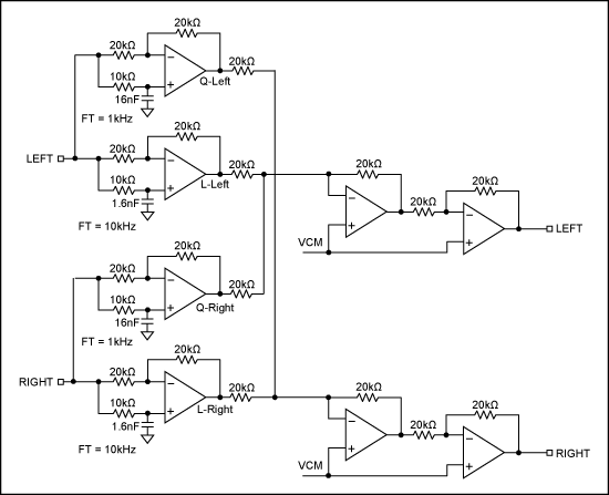 無源方案可以實(shí)現(xiàn)該電路,但是更通用的方法是有源電路(圖7)。對于線性信號(hào)(相應(yīng)的輸入通道),電路呈現(xiàn)為一個(gè)ft=10kHz的相移濾波器,對于積分信號(hào)(另一路輸入),電路呈現(xiàn)為一個(gè)ft=1kHz的相移濾波器。目的是使線性輸入信號(hào)和積分信號(hào)之間在音頻帶寬1kHz至10kHz范圍內(nèi)呈現(xiàn)90°相移。