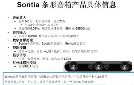 Sontia的業(yè)務(wù)模型比較有特點(diǎn),也采用授權(quán)模式,主要模式是Sontia授權(quán)其3-聲道條形音箱參考設(shè)計(jì),Sontia為OEM提供了一個(gè)可以直接生產(chǎn)的完整套裝,或者采用預(yù)付版權(quán)費(fèi)以及與銷售量有關(guān)的版權(quán)費(fèi)模式,Sontia未來(lái)的產(chǎn)品走向?qū)⑾蚋叨藯l形音箱參考設(shè)計(jì)、便攜式多媒體播放器的底座(iPod)以及Sontia的數(shù)字音頻處理技術(shù)直接嵌入到電視里中的軟件解決方案發(fā)展。