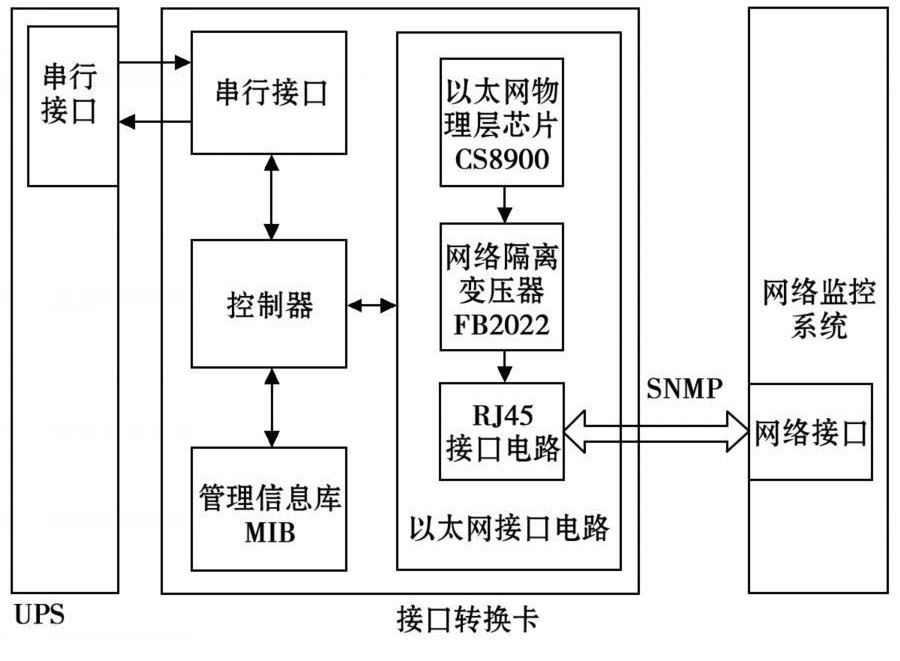 整個系統(tǒng)的核心為基于SNMP網(wǎng)絡(luò)管理協(xié)議的接口轉(zhuǎn)換卡。接口轉(zhuǎn)換卡一端通過網(wǎng)線與監(jiān)控計算機相連,管理人員通過計算機可方便地對其進行操作。接口轉(zhuǎn)換卡另一端通過與UPS上的串行接口連接,來獲取UPS工作的各種信息及參數(shù),然后再利用SNMP協(xié)議將接收到的數(shù)據(jù)轉(zhuǎn)換為管理信息庫(MIB)節(jié)點的變量值。管理員通過網(wǎng)絡(luò)管理軟件對MIB節(jié)點變量進行操作,從而獲得各UPS的監(jiān)控信息,實現(xiàn)了安全可靠的遠(yuǎn)程分散式管理。