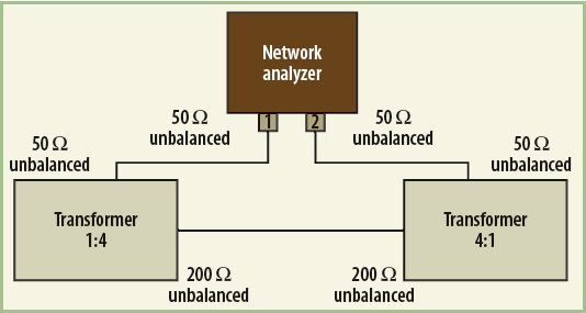 測量在Advantest的一個(gè)商用VNA,300kHz至3.8GHz模型R3765CG上進(jìn)行。這個(gè)分析儀配有50Ω端接阻抗的非平衡測試端口。由于寬帶unun阻抗變壓器具有非平衡終端,轉(zhuǎn)換比率為1:4,為了讓該器件與測試設(shè)備相匹配,需要另一個(gè)轉(zhuǎn)換比率為4:1的器件來執(zhí)行阻抗轉(zhuǎn)換。圖6和圖7顯示了所有的終端連接。測試終端和所有用于VNA的線纜都經(jīng)過校準(zhǔn),以最大限度地減少它們出現(xiàn)錯(cuò)誤的可能性。插損和通帶響應(yīng)利用表示為對數(shù)幅值形式的傳輸系數(shù)S21來分析。