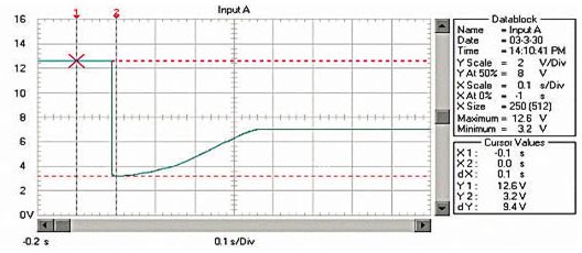 由于RM、RB、RL均非常低,啟動電流非 常大。例如用12V、45Ah的蓄電池啟動安裝1.9升柴油機的汽車,蓄電池的電壓在啟動瞬間由12.6V降到約3.6V!啟動過程的蓄電池電壓波形如圖 1;啟動瞬時的電流達550A,約為蓄電池的12C的放電率!啟動過程的蓄電池電流波形如圖2,(電流傳感器的電流/電壓變換比率:100A/V)。盡管 車用蓄電池是啟動專用蓄電池,可以高倍率放電,但在圖1中可以看出,10倍以上的高倍率放電時的蓄電池性能變得很差,而且,如此高倍率放電對蓄電池的損傷 也是非常明顯的。啟動過程的電壓劇烈變化也是極強的電磁干擾,可以造成電氣設備的“掉電”,迫使電氣設備在發(fā)電機啟動過程結(jié)束后重新上電,計算機在這個過程中非常容易死機。因此,無論從改善汽車電氣設備的電磁環(huán)境還是改善汽車的啟動性能和蓄電池的性能、延長使用壽命來考慮,改善汽車電源在啟動過程的性能是必要的。