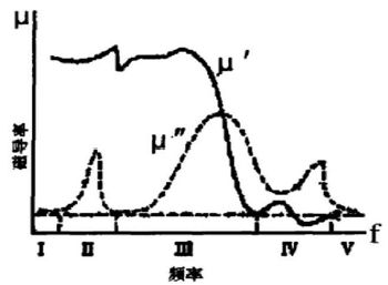 圖 3 是磁導(dǎo)率的頻散特性曲線,它可分為Ⅰ-Ⅴ個(gè)區(qū)域來分析??梢姡谝欢ǖ念l率范圍內(nèi) μ'''' 值(在某一磁場(chǎng)下的磁導(dǎo)率)保持不變,然后隨頻率的升高磁導(dǎo)率 μ'''' 有一最大值。頻率再增加時(shí),μ'''' 迅速下降。代表材料損耗的虛數(shù)磁導(dǎo)率 μ" 在低頻時(shí)數(shù)值較小,隨著頻率增加,材料的損耗(即μ")增加。