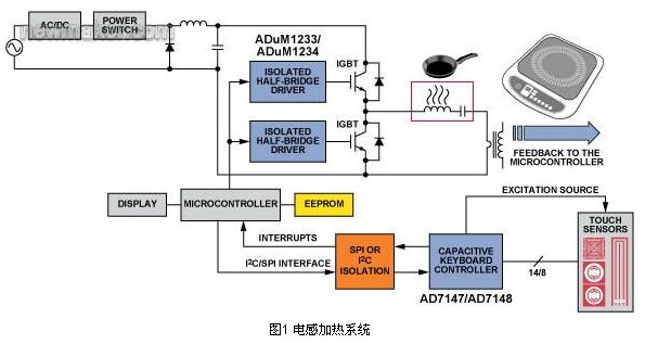 電感元件與變壓器類(lèi)似,能夠產(chǎn)生磁場(chǎng)。在將金屬鍋置于磁場(chǎng)中時(shí),則會(huì)產(chǎn)生渦電流,電能轉(zhuǎn)換為熱能,通過(guò)金屬的熱傳導(dǎo)來(lái)加熱食物。由電學(xué)的觀點(diǎn)來(lái)看,電感元件驅(qū)動(dòng)有損LC諧振電路,損耗產(chǎn)生了熱量。圖1所示電感加熱系統(tǒng)框圖。