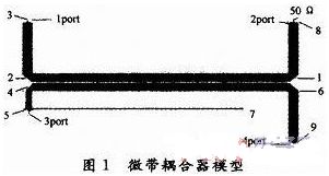 微帶定向耦合器在ADS中的模型如圖1所示。是一個四端口器件,中間是一段耦合線。四個端口分別連接于外部的50Ω端口。從5點到7點是高阻抗線,7端點接地,這個長度是一個變量。連接每個端口(3端口除外)的微帶線寬度是2.25mm,長度是14.4mm,3端口連接的微帶線寬度是1.4mm,長度是5mm。耦合線的長度是57.7mm,導(dǎo)帶寬度是2.1mm,導(dǎo)帶間距是O.45mm。本文主要討論高阻抗線的作用,所以先將高阻抗線長度置于零。PCB板采用PTFE材料,介電常數(shù)是2.5,厚度是0.5cm。