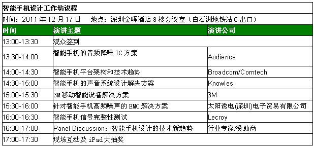 HTC、SAMSUNG、LG、SHARP、AT&T、SK Telecom、PANTECH、DoCoMo 等手機(jī)設(shè)計(jì)領(lǐng)軍廠商在智能市場(chǎng)領(lǐng)域的競(jìng)爭(zhēng)非常激烈,他們都用到哪些技術(shù)?由我愛方案網(wǎng)(www.52solution.com)、電子元件技術(shù)網(wǎng)(www.moorji.com)和China Outlook Consulting主辦的首屆智能手機(jī)設(shè)計(jì)工作坊(Smart Phone Design Workshop)將于2011年12月17日下午在深圳金暉酒店8樓會(huì)議室隆重召開!為您Hold 住 2012 智能趨勢(shì),給力手機(jī)開發(fā)設(shè)計(jì)!